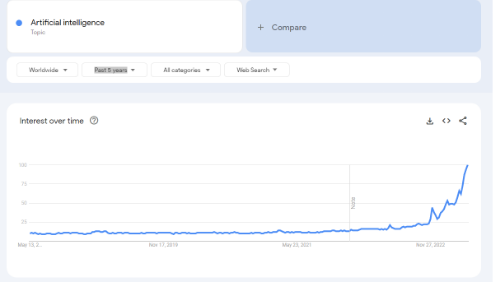 To provide evidence for my claim about the sharp interest in Artificial Intelligence, the below snapshot taken from Google Trends is sufficient. November 2022 was when OpenAI released ChatGPT, the spike started in November. Numbers and data never lie.