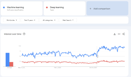 Not only did ChatGPT spike the interest in the word Artificial Intelligence but also two other words started doing rounds on the internet, Machine Learning (ML) and Deep Learning. Again, I am going to let the numbers do the talking courtesy of Google Trends.