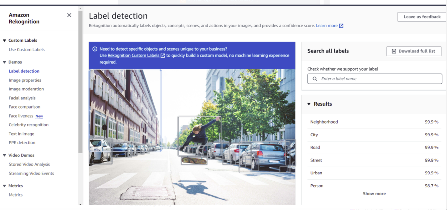 - Custom Labels: Amazon Rekognition can be trained to recognize custom labels, allowing you to create your own image and video recognition models.
