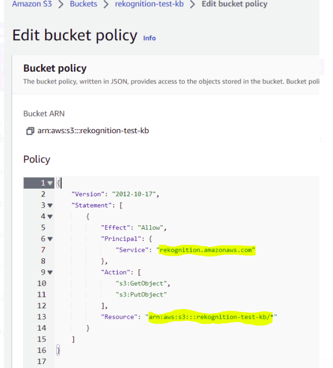 We create a bucket named “recognition-test-kb”. Now you must assign permissions to the bucket so that AWS recognition can access the images in the bucket. You need to add the policy as shown below: