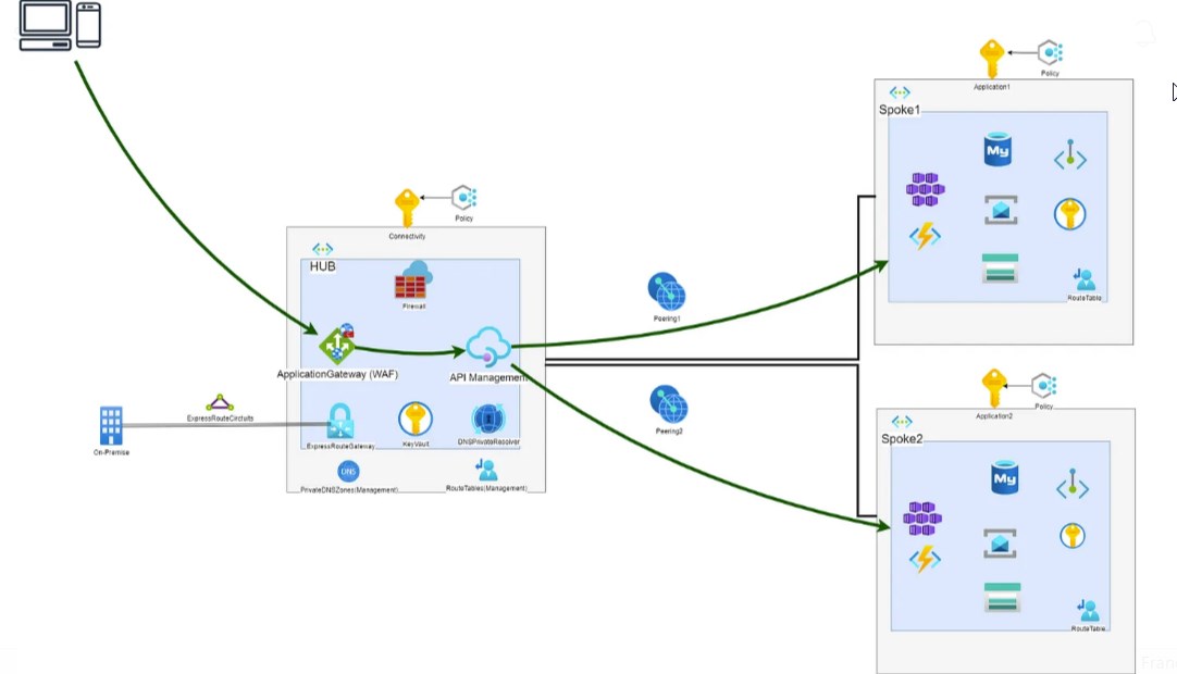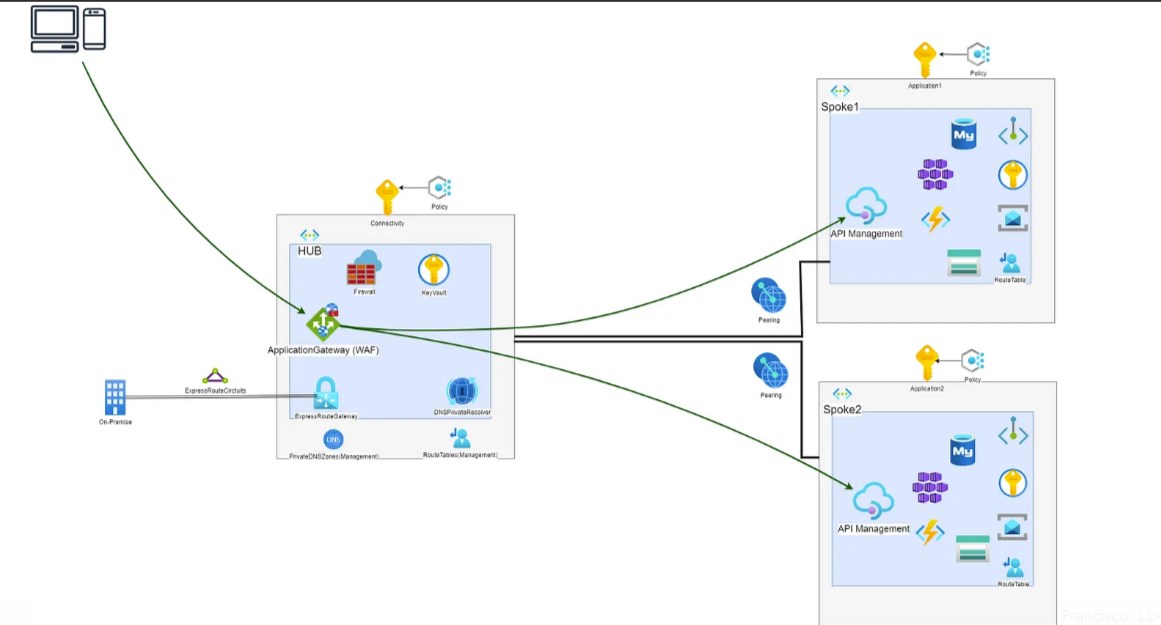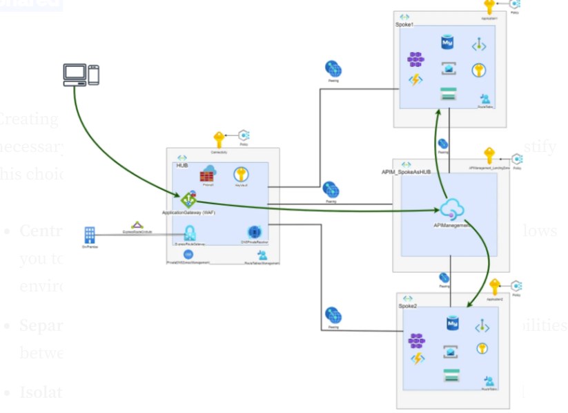 In summary, the creation of a Landing Zone dedicated to Azure API Management in a network that acts as a spoke to the hub, but as a hub compared to spokes that contain backend services, allows you to centralize the management of APIs, ensure security and scalability and improve API monitoring and analysis, while maintaining a clear separation of concerns between the HUB and the API Management.