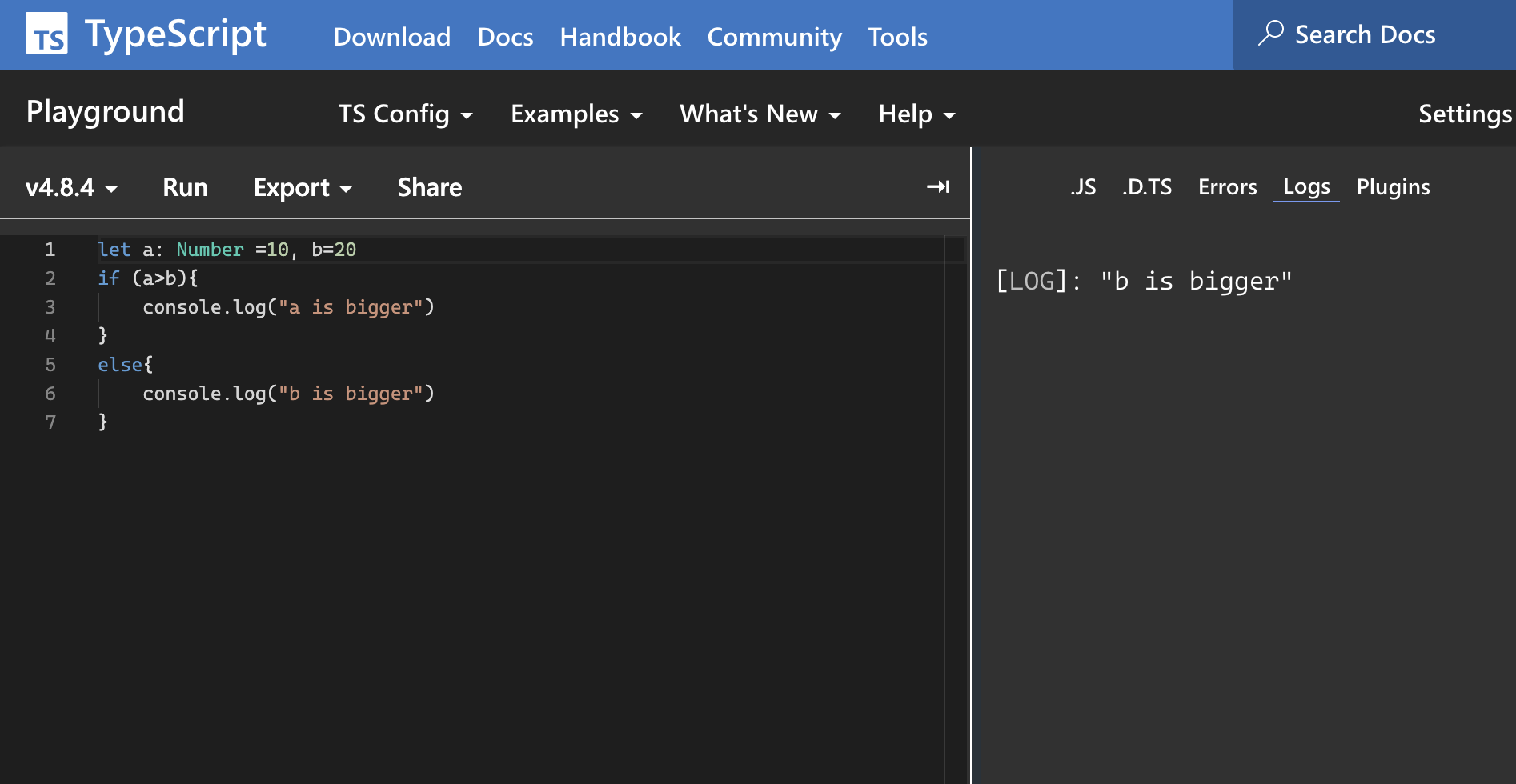The conditionals in TypeScript are very much similar to JavaScript. The Type Script follows the same if else block. Example in the screenshot attached.