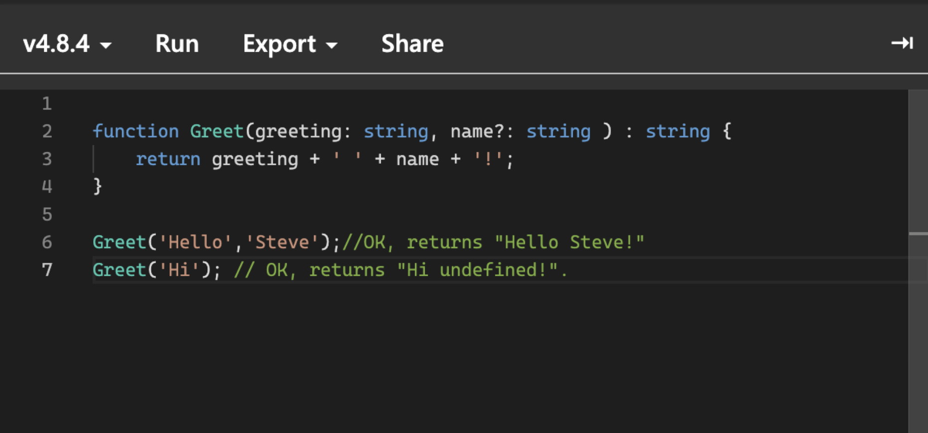 greeting(); //Output: Hello TypeScript!