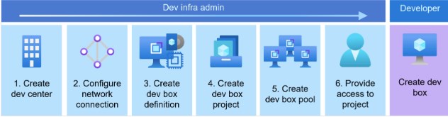 The following graphic shows the steps required to configure Microsoft Dev Box in the Azure portal.First, you create a dev center to organize your dev box resources.