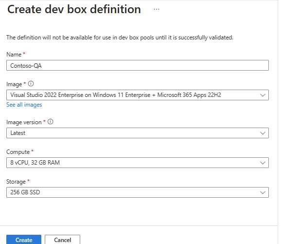 Dev box definitions define the image and SKU (compute + storage) that’s used in the creation of the dev boxes. To create and configure a dev box definition: