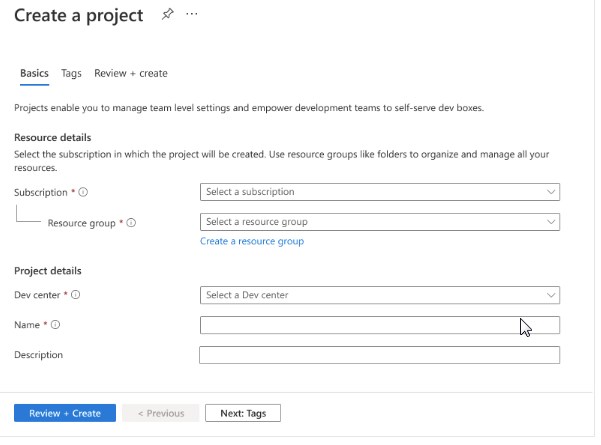 | Dev center | Select the dev center that you want to associate with this project. All the settings at the dev center level apply to the project. |