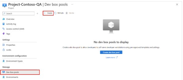 A dev box pool is a collection of dev boxes that have similar settings. Dev box pools specify the dev box definitions and network connections that dev boxes use. You must associate at least one pool with your project before users can create a dev box.