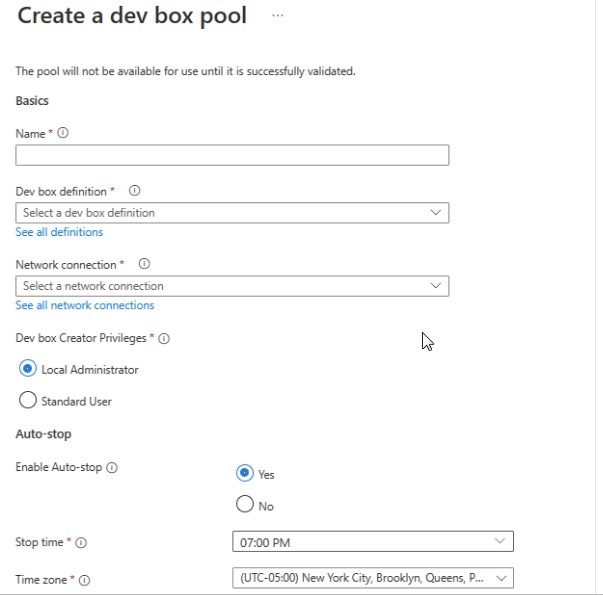 | Dev box definition | Select an existing dev box definition. The definition determines the base image and size for the dev boxes that are created in this pool. |