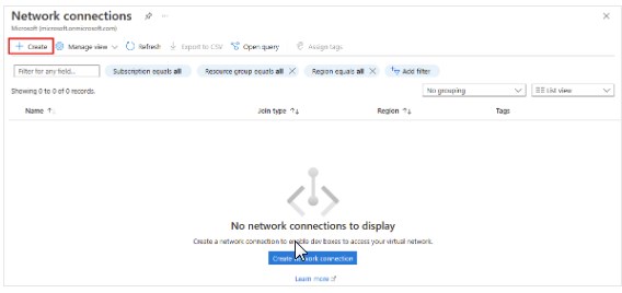 Network connections determine the region in which dev boxes are deployed. They also allow dev boxes to be connected to your existing virtual networks. The following steps show you how to create and configure a network connection in Microsoft Dev Box .