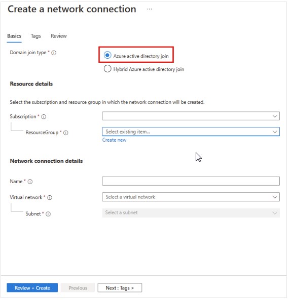 You now need a network connection to associate the virtual network and subnet with the dev center. A network connection specifies the type of join dev boxes use to join your Azure AD domain, either an Azure AD join or a hybrid Active Directory join.