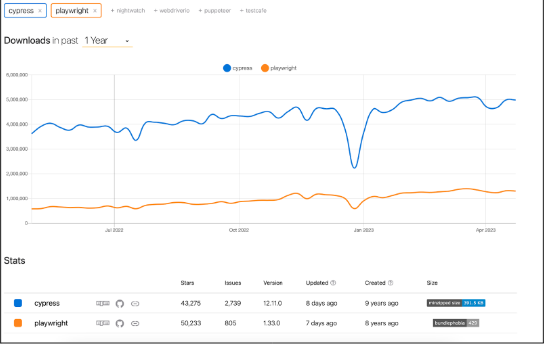 Looking at the npm trends for both Cypress and Playwright can give us some insights into their popularity and adoption rates.