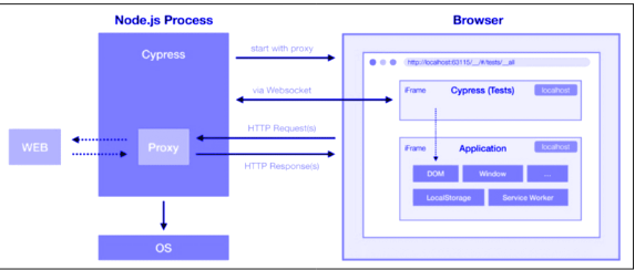 Behind the scenes, Cypress runs a Node.js server that communicates with the browser via a WebSocket. This communication channel allows the two processes to synchronise and perform tasks on each other’s behalf.