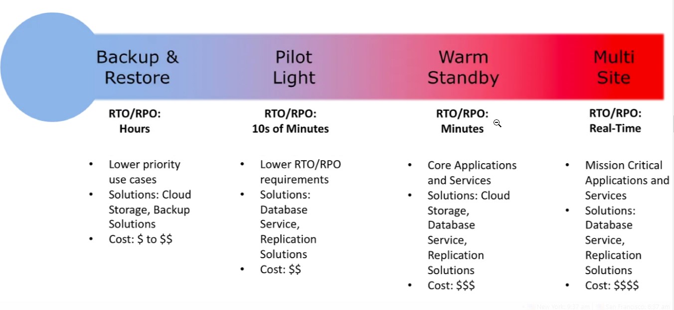 For the DR scenarios options, RTO and RPO reduces with an increase in Cost as you move from Backup & Restore option (left) to Multi-Site option (right)