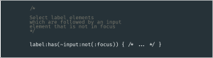 In the first example, we’re trying to style the label element in accordance with the input element’s current state. The label’s color will change from blue to red depending on whether the input element has an invalid value.