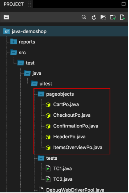 There are numerous Page Object files in the project tree. Each will represent a significant piece of a web page (not necessarily an entire web page). Utilizing a Page Object model removes the UI definition from your test code, making it easier to maintain and less likely to break your tests.