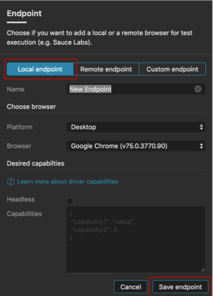 Step 8: Choose the Local endpoint. “Local Chrome,” we’ll call it. Then choose Google Chrome browser after setting the Platform to Desktop. Next, select the Save endpoint option.