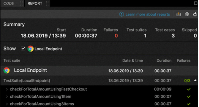 Step 12: The test run report shows the duration of the test, the number of test failures (if any), the number of test suites and test cases executed, and much more. To check the duration of each test case run, click the down arrow next to the TestSuite(Desktop) item.