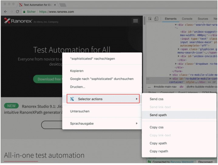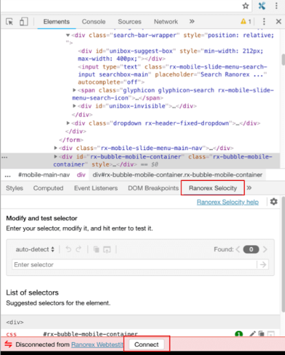 Next, just launch Chrome, right-click on any site element, and select Inspect. Click Ranorex Selocity in the DevTools window, then Connect.
