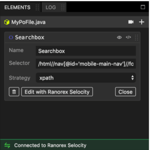 Step 6: When you return to Ranorex Webtestit, you’ll see a new element in the Elements panel. If the element’s name isn’t meaningful, you can change it. The name has been changed to “Search box” in the example below. Now press the Close button.