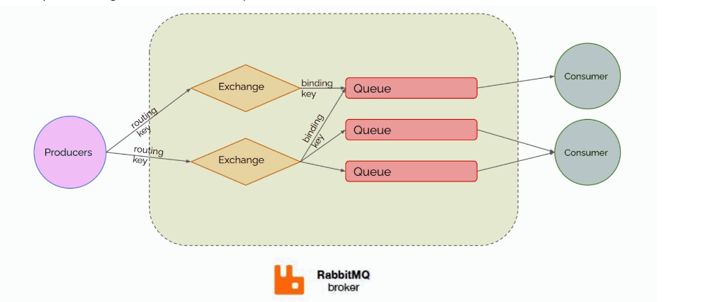- Exchanges: RabbitMQ exchanges route messages. They route producer messages to queues using defined routing rules. RabbitMQ enables direct, fanout, topic, and header exchanges to route messages to queues.