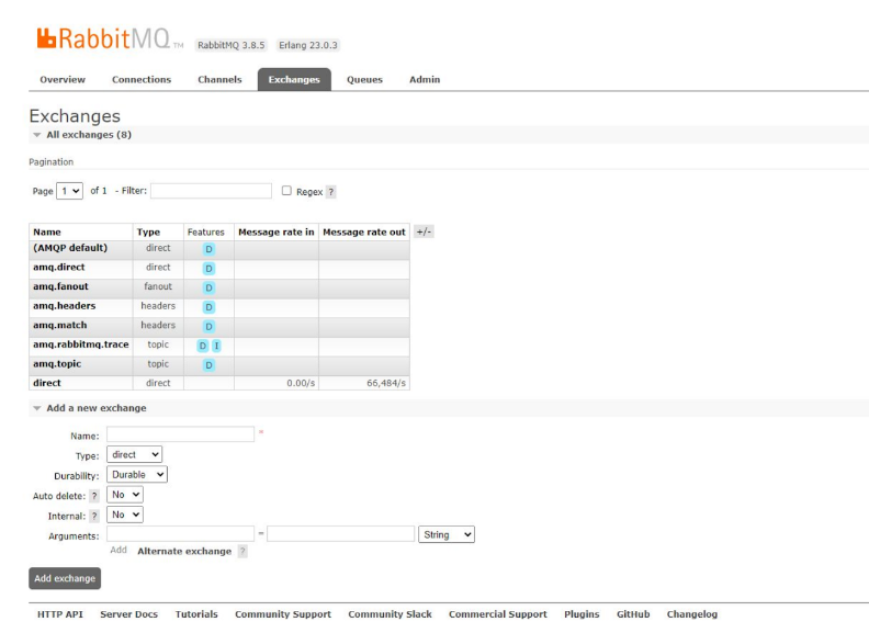- Exchange types: nameless (empty string – default one), fanout, direct, topic, headers