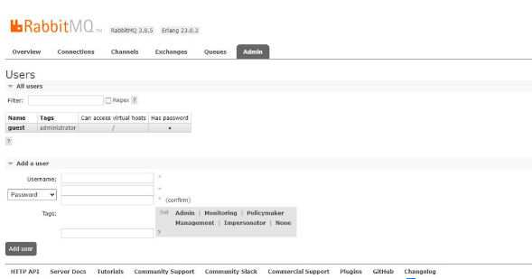 Optionally, create virtual hosts, and users, and set permissions in the RabbitMQ management console to control access to RabbitMQ resources.