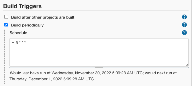 Step 5: Setup your build parameter. Here I have set it in a cron method. The 5:00 AM UTC daily.