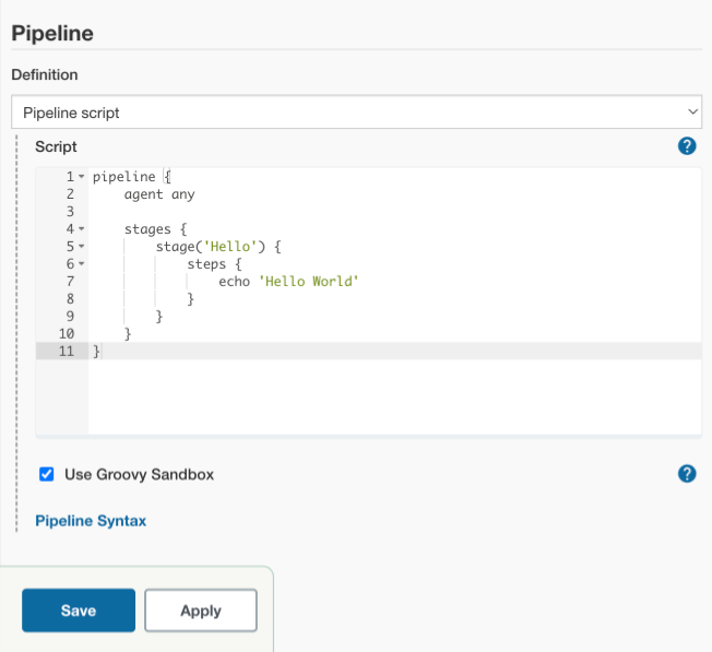 Step 6: Now you can add the pipeline. Here in this sample pipeline, I am only printing hello world.