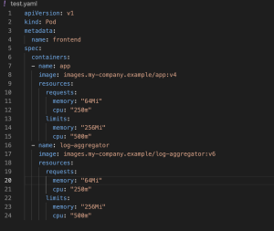 This following Pod holds two containers. Allotted resources of 0.25 CPU and 64MiB (226 bytes) of memory are specified for both containers during their definition. Limits of 0.5 CPU and 256 MiB of memory are placed on each container. That is, the Pod can use up to 1 CPU and 256MiB of memory, yet it requests only 0.5 CPU and 256MiB.