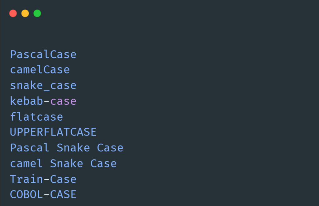 When naming files and components, we often use Pascal Case or Camelcase. There are still a variety of cases developers use, such as the kebab case, the snake case, etc.
