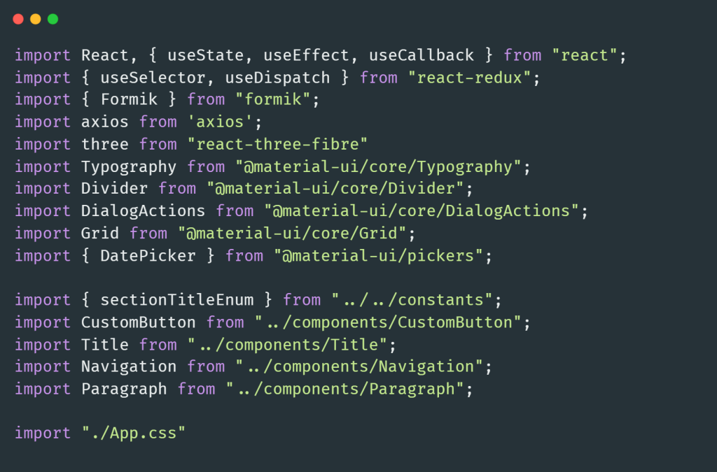 Since React is not an all-encompassing library, if you are a React developer, you are already aware that we import a lot of community libraries. We also import various style files, utils files, component files, and other files as necessary. The import section needs to maintain a sensible organizational structure or group in order to keep the code readable and maintainable.