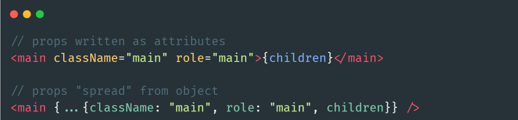 Spread attributes are a JSX feature. It is syntactic sugar for passing every property of an object as JSX attributes. We can quickly copy all or a portion of an existing array or object into another array or object using the JavaScript spread operator (…).