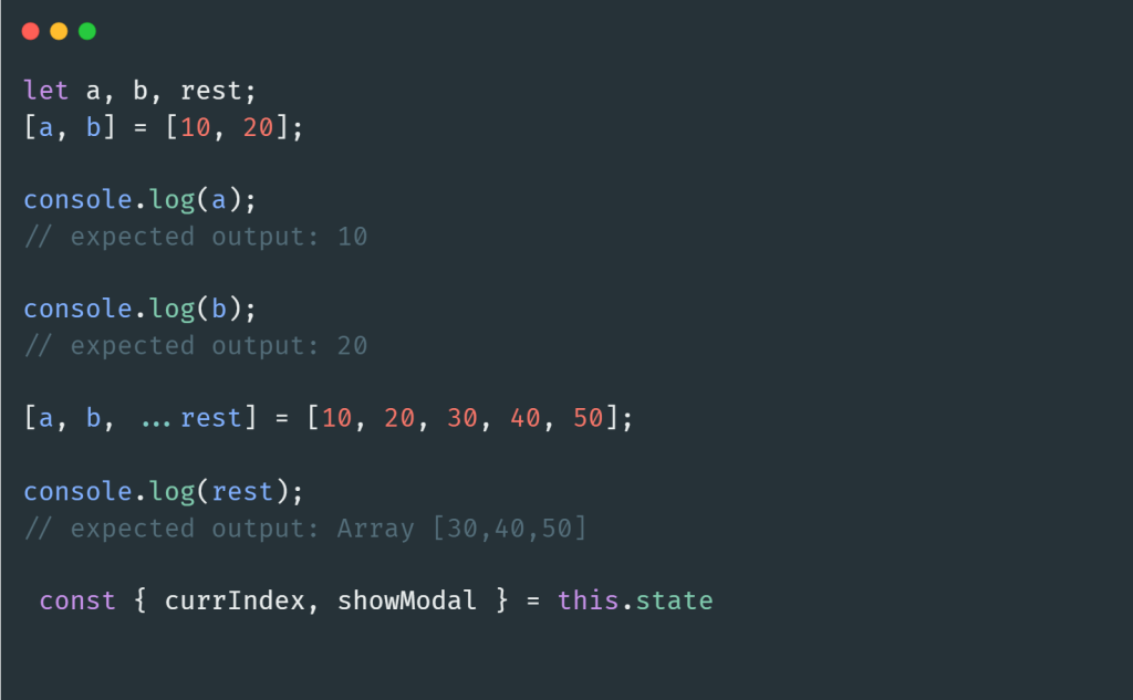 The destruction shown assigns properties of an object to variables of the same name. The destructuring assignment syntax is a JavaScript expression that makes it possible to unpack values from arrays, or properties from objects, into distinct variables.