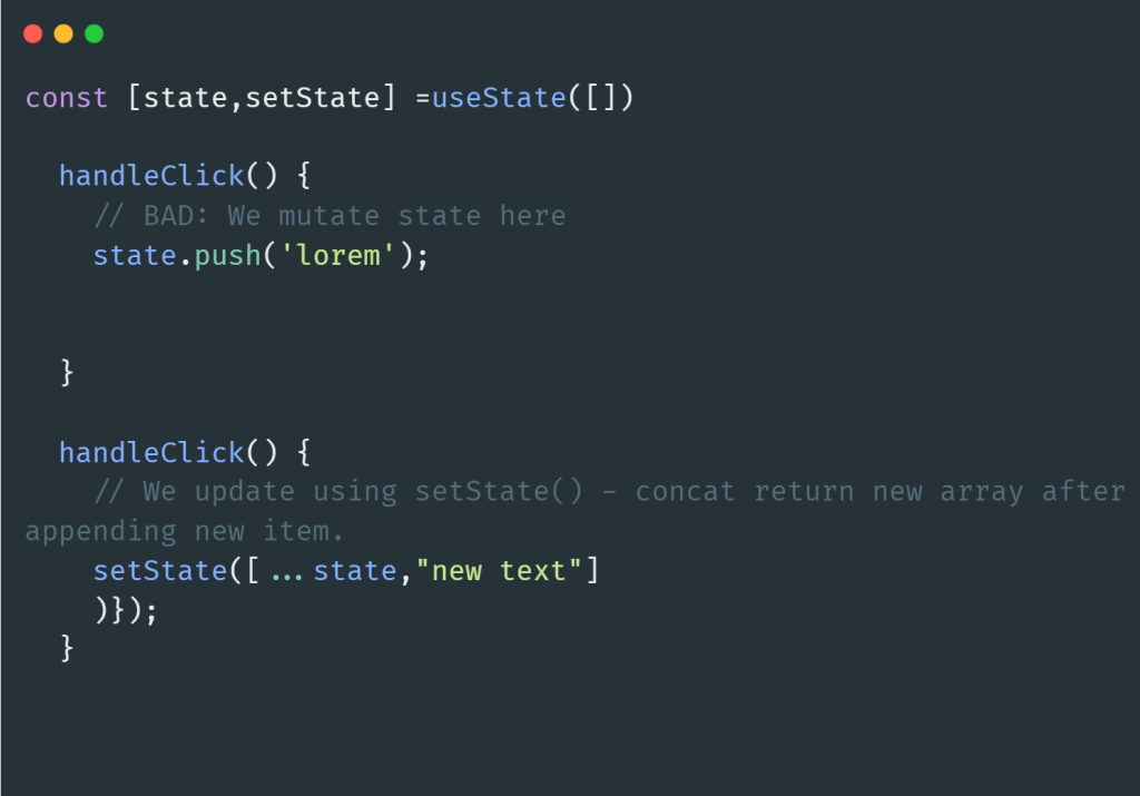 When we try to change the state of our component without using setState() it causes state changes without making the component re-render. Whenever setState gets called in the future, the mutated state gets applied.