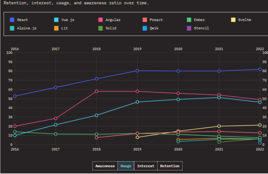 Undoubtedly, React is the most popular front-end library and one of the trendiest technologies to learn. According to the 2022 State of JS survey, React holds the top position in terms of usage.