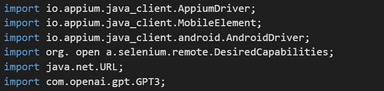 To begin, we import the required dependencies that include Appium and OpenAI GPT3 libraries.