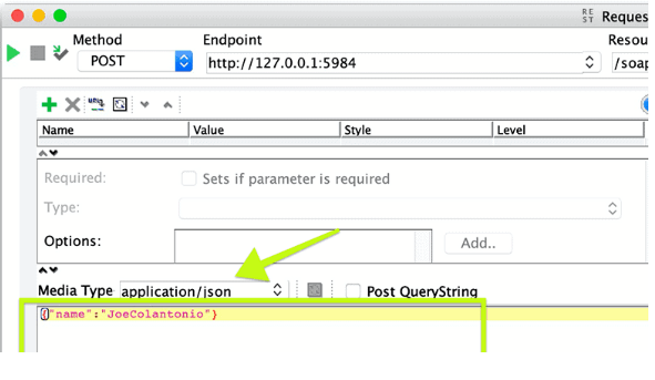 6. In the text box next to the Media Type, enter the JSON that you want to post. Let’s keep things simple and construct a JSON value with simply one string name/value combination.