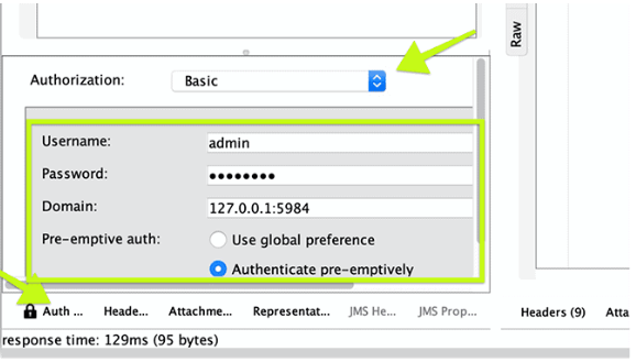 5. If you set up a login and password for your CouchDB installation, go to the Request 1 Authentication page. Choose Basic from the drop-down selection for Authorization. Insert your username, password, and domain here: http://127.0.0.1:5984/. Choose the Authenticate preemptively radio button as well.