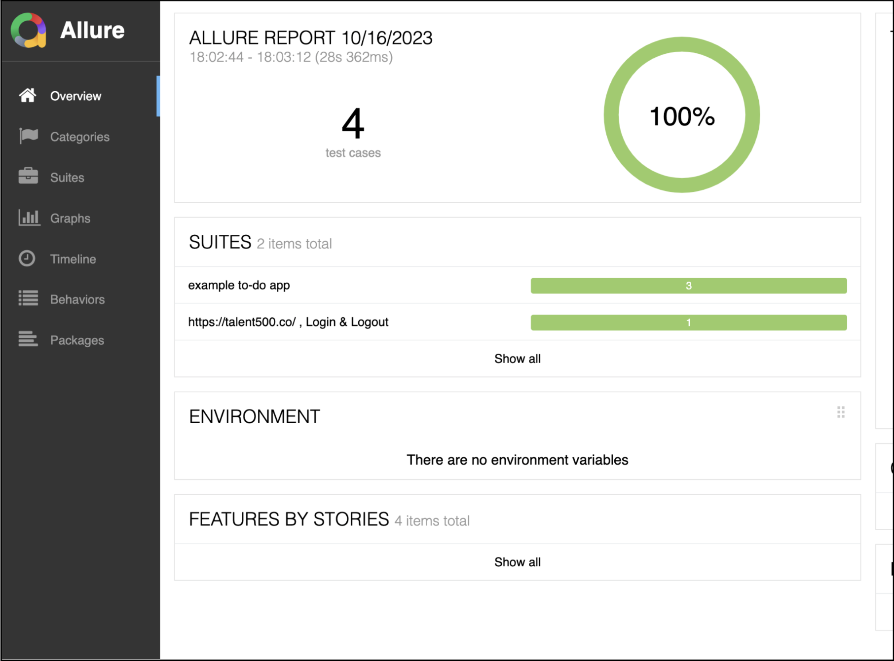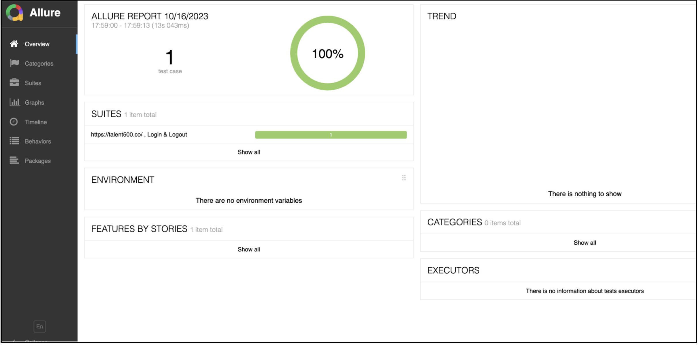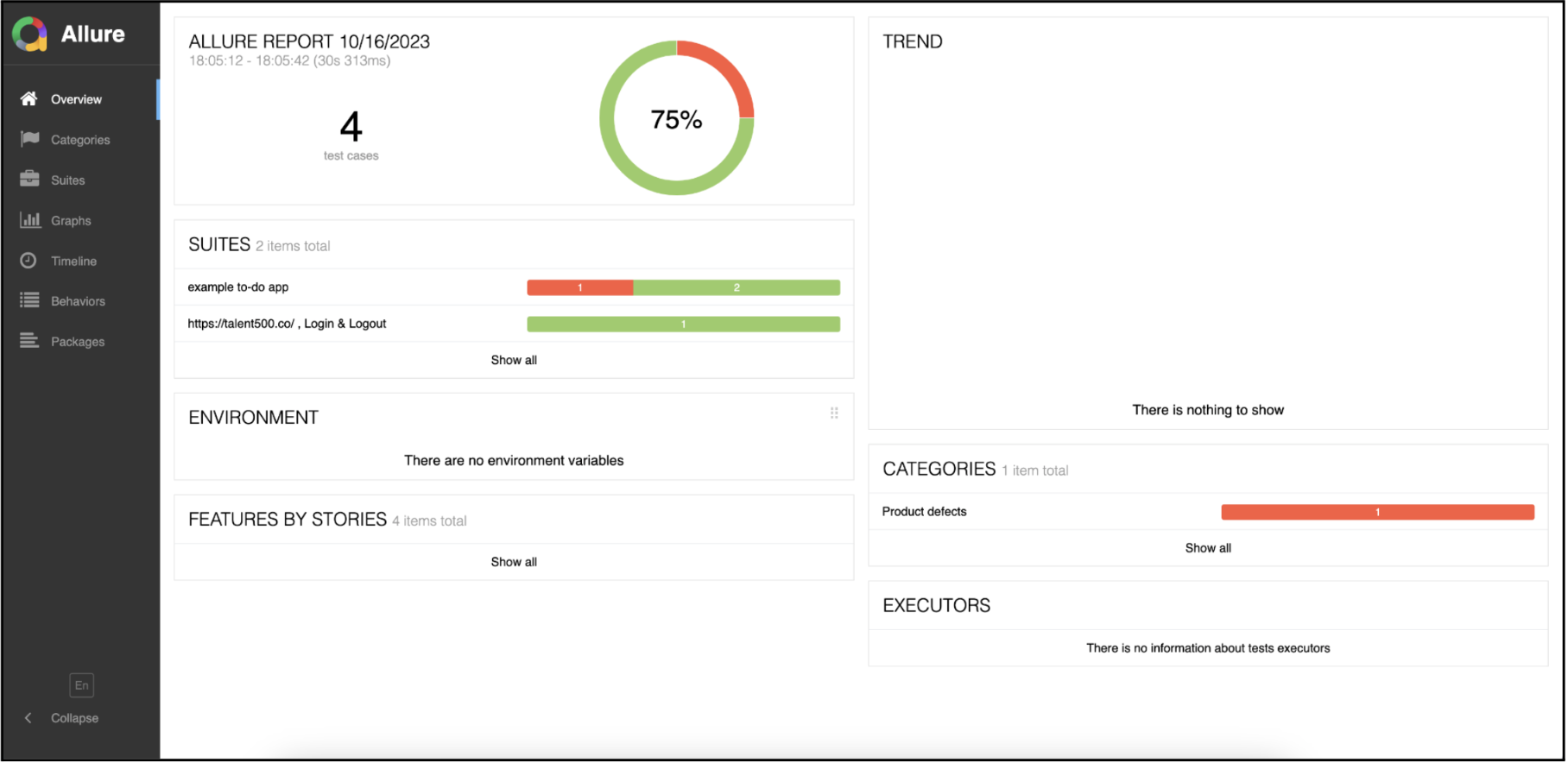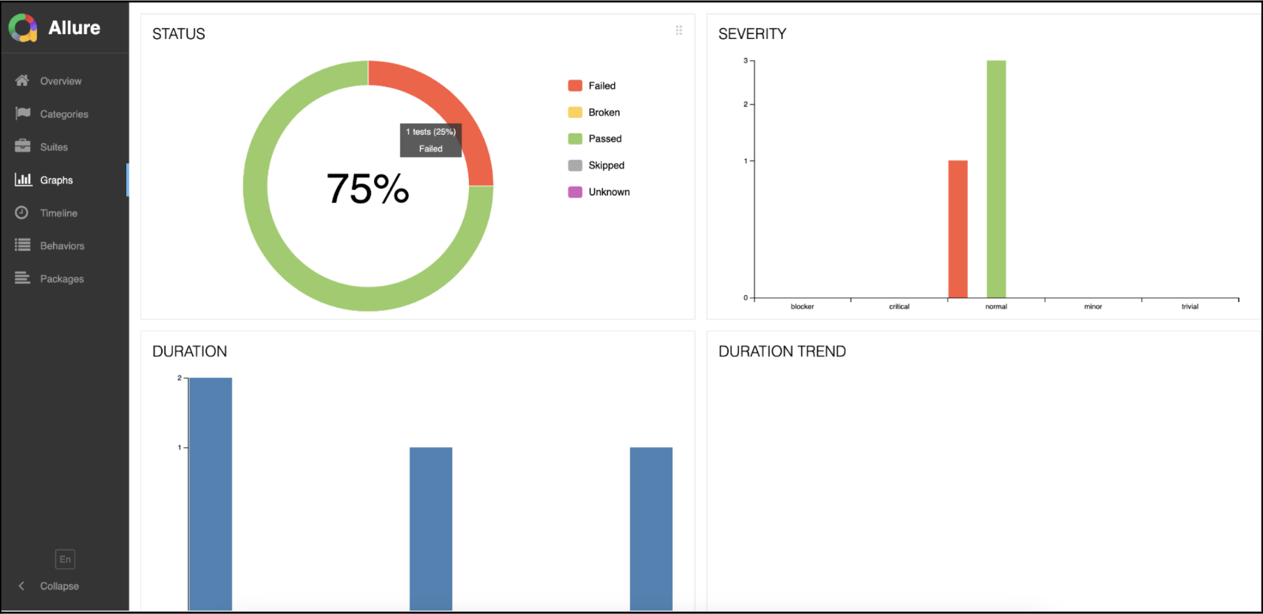 - You may compare current results with previous runs using Allure’s historical test execution data storage feature.