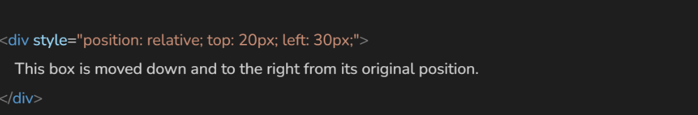 When an element is set to position: relative, it is positioned relative to its normal position in the document flow. This means that the element will still occupy space in the layout as if it were not moved. You can adjust its position using the top, right, bottom, or left properties.