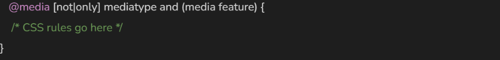 The basic syntax for a media query consists of the @media rule. It is followed by a media type and one or more media features.