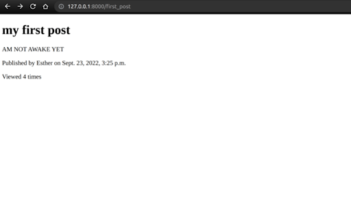 The view count might be displayed in the template. Include this <p>Viewed {{ post.view_count }} times</p> inside the publisher/templates/post.html file. Do a few views on a post now and see how the counter rises.