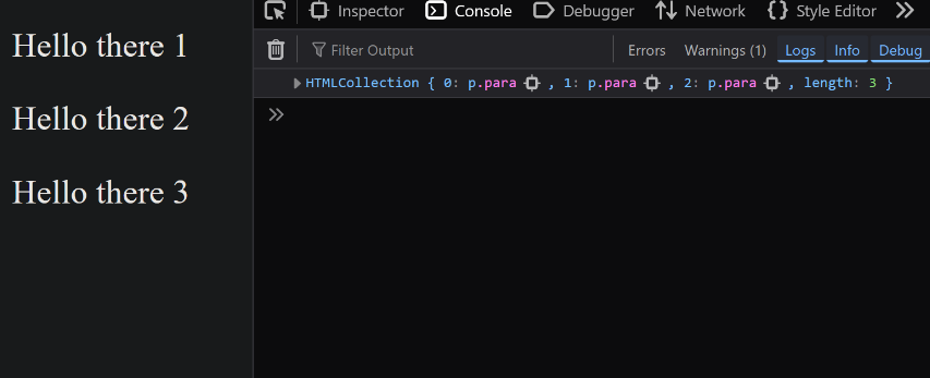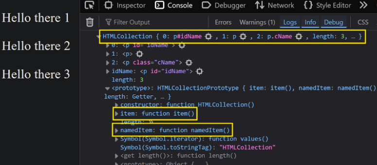 As you can see, getElementsByTagName() returns an HTMLCollection, which is similar to an array. Although it is not a true array, you can still access its items using an index or by using the item() and namedItem() methods to access individual elements.