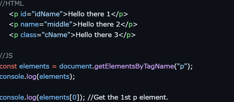To select elements by their tag name, we use the getElementsByTagName() method. This method takes a tag name as an argument and returns an array-like object called an HTMLCollection, which contains all elements with the specified tag.Â