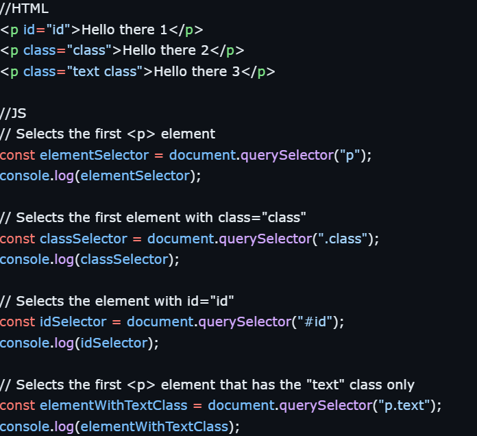 The querySelector() method selects the first element that matches the specified CSS selector. This method accepts any valid CSS selector, including element names, classes, and IDs.