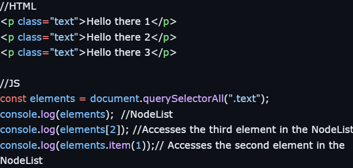 This approach allows you to select multiple elements and then work with each one individually. The NodeList returned is similar to an array, though it is not an actual array object, which means not all array methods are available.Â