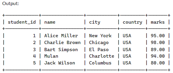 | CREATE TABLE Students ( student_id INT PRIMARY KEY AUTO_INCREMENT, name VARCHAR(100) NOT NULL, — Combine first and last name city VARCHAR(50), country VARCHAR(50), marks DECIMAL(5,2) ); INSERT INTO Students (name, city, country, marks) VALUES (‘Alice Miller, ‘New York‘, ‘USA‘, 95.0), (‘Charlie Brown‘, ‘Chicago‘, ‘USA‘, 98.0), (‘Bart Simpson‘, ‘El Paso‘, ‘USA‘, 89.0), (‘Mulan’, ‘Charlotte’, ‘USA‘, 94.0), — add more of your choice |