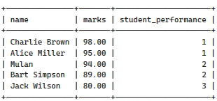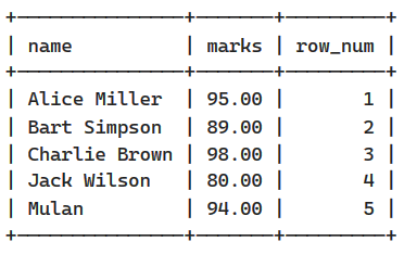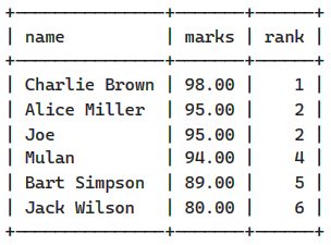 | SELECT name, marks, RANK() OVER (ORDER BY marks DESC) AS ‘rank’ FROM ( SELECT name, marks FROM Students ) AS ranked_students; |