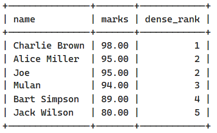 Similar to the previous query, this query will also return the top 5 students scoring the highest marks, but using the DENSE_RANK() function.