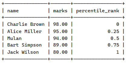 | SELECT name, marks, PERCENT_RANK() OVER (ORDER BY marks DESC) AS percentile_rank FROM Students; |